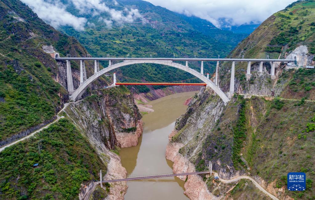 7月22日拍摄的大瑞铁路大保段澜沧江特大桥,红色桥梁为中缅油气管道桥,下方为霁虹桥,呈现三桥并跨澜沧江景观(无人机照片)。新华社记者 陈欣波 摄