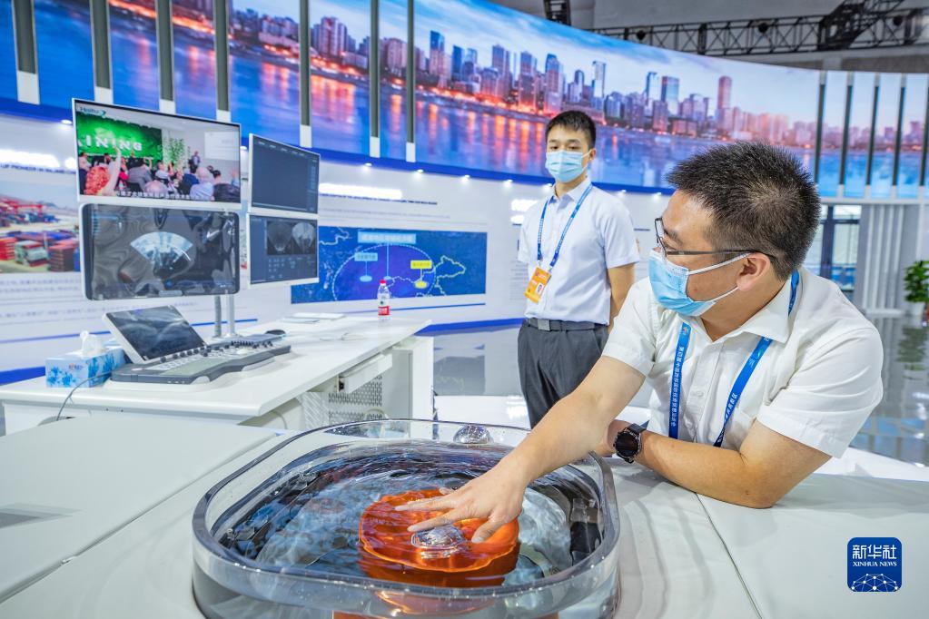 7月22日,西洽会重庆馆内的工作人员演示“海扶刀”超声肿瘤治疗系统。