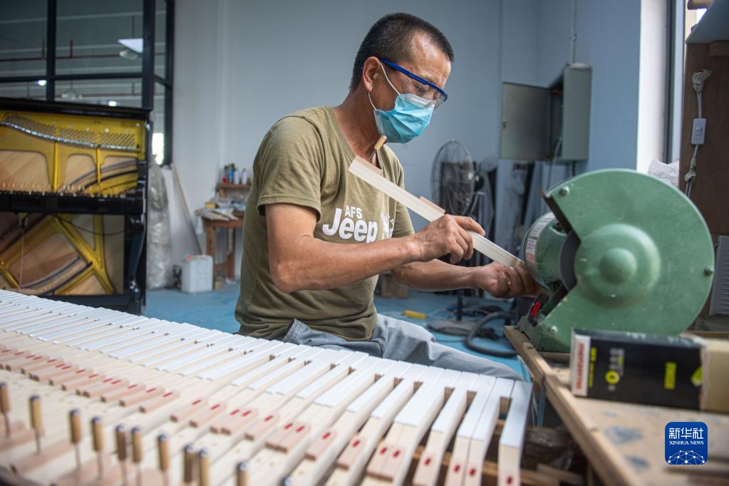 7月22日,工人在洛舍镇一钢琴制造企业内打磨钢琴琴键。