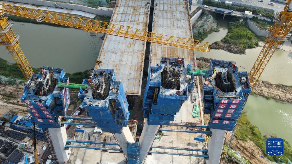 7月22日,工人在中铁四局引江济淮工程江淮沟通段金寨南路桥项目现场错时施工(无人机照片)。