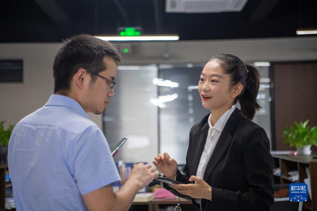 7月21日,在重庆华代律师事务所,谭婷(右)与同事交流。