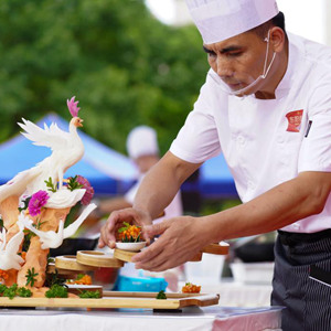 7月22日,在重庆市北碚区缙云广场,厨师在制作特色菜肴。