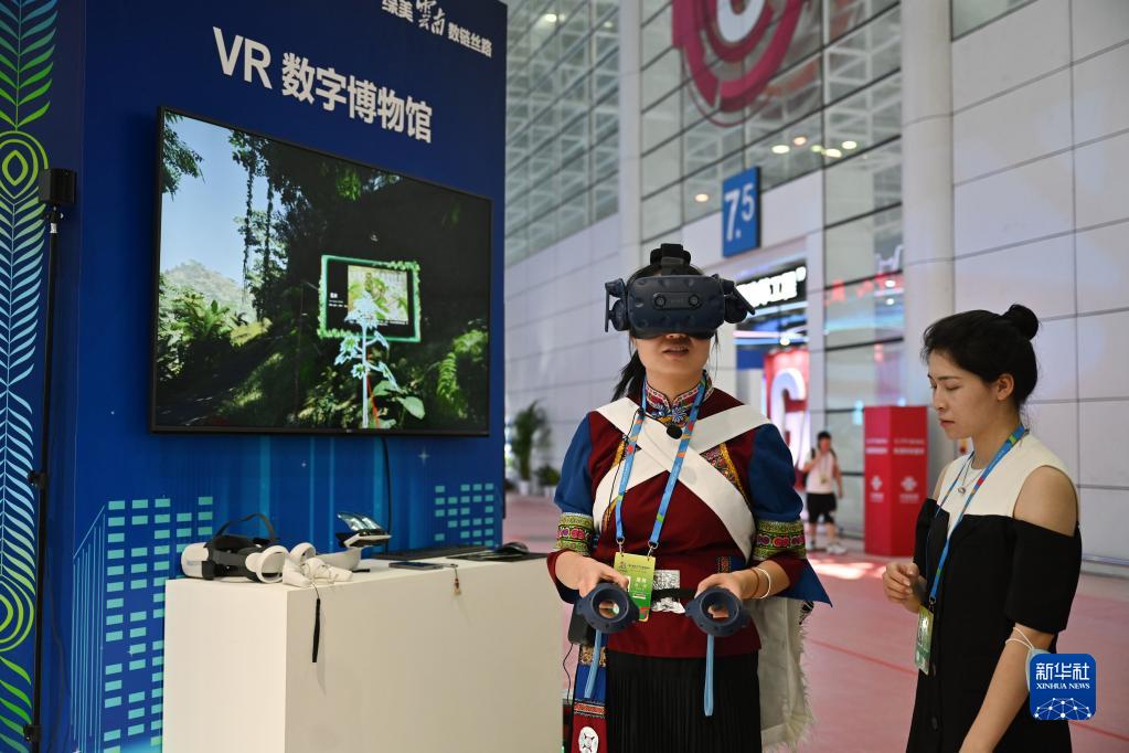 7月22日,观众在第五届数字中国建设成果展览会上体验VR数字博物馆项目。 新华社记者 周义 摄
