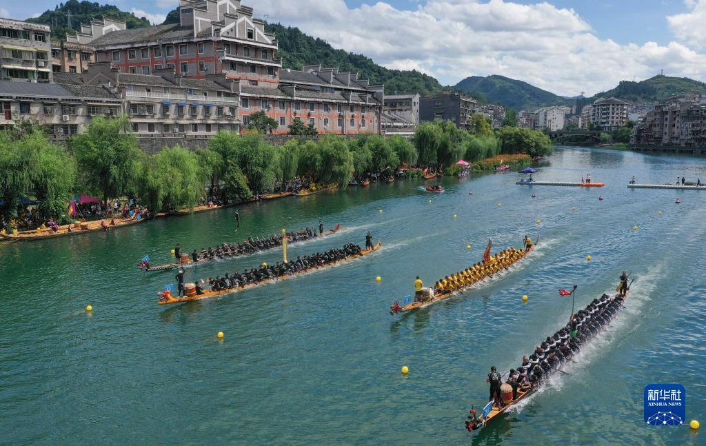 7月22日,参赛龙舟队在贵州省黔东南苗族侗族自治州镇远县㵲阳河上比赛(无人机照片)。
