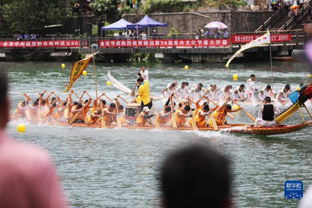 7月22日,龙舟队在贵州省镇远县㵲阳河上参加龙舟比赛。