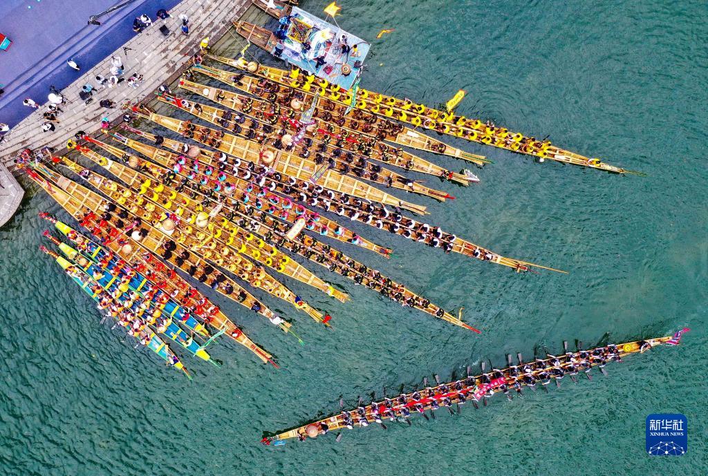 7月22日,参赛龙舟队在贵州省黔东南苗族侗族自治州镇远县㵲阳河上集结(无人机照片)。