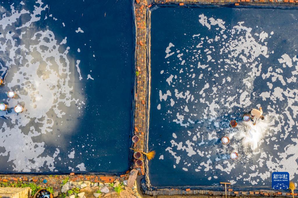 7月23日,盐农在浙江省宁波市北仑区白峰街道外峙岛上的盐田收盐(无人机照片)。