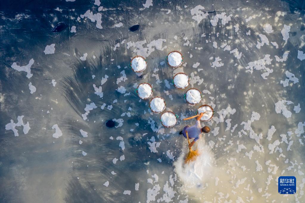 7月23日,盐农在浙江省宁波市北仑区白峰街道外峙岛上的盐田收盐(无人机照片)。