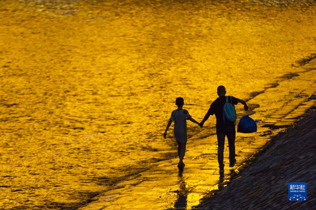 7月14日,游客在松花江哈尔滨段江畔游玩。
