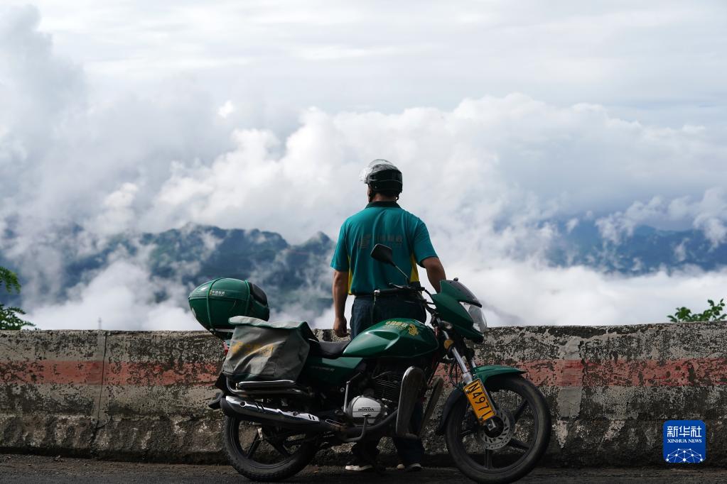 送件途中,赵月芳在路边休息(7月13日摄)。鹅屋邮政所地处山西省长治市壶关县大峡谷镇海拔超过1400米的太行山深处,是方圆几十公里内的唯一的邮政所,也是赵月芳工作的地方。