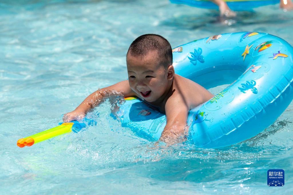 7月23日,一名小朋友在贵州省黔东南苗族侗族自治州从江县丙妹镇的一家游泳馆内戏水玩耍。