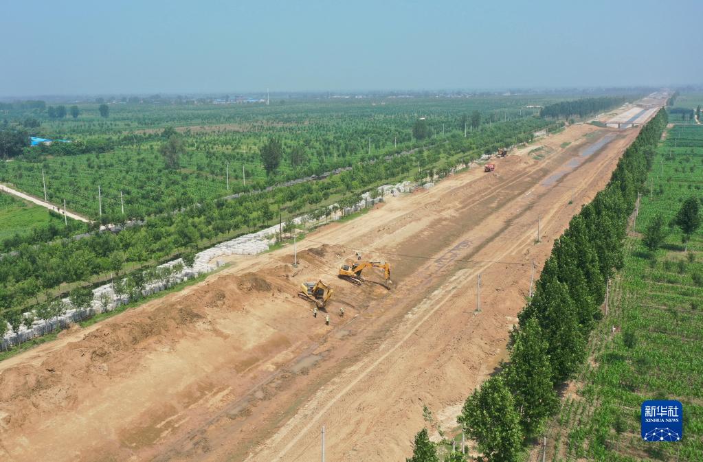7月23日,工人在河北省新河县“水系连通及水美乡村建设”项目中的六户渠工地施工(无人机照片)。