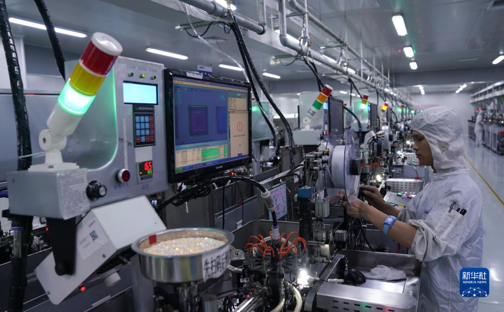 江西兆驰光元科技股份有限公司的工作人员在车间进行LED封装编带工序(2021年6月25日摄)。