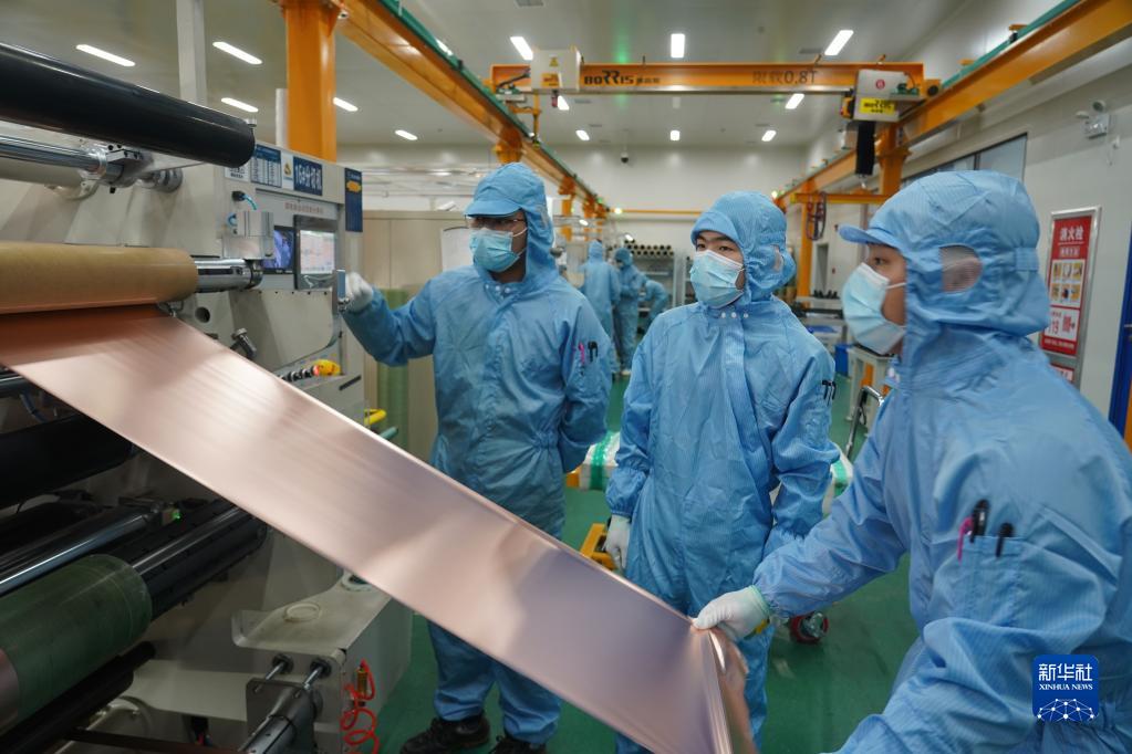 在位于江西南昌高新区的江铜耶兹铜箔有限公司,工人进行锂电铜箔分切工序(2022年5月12日摄)。