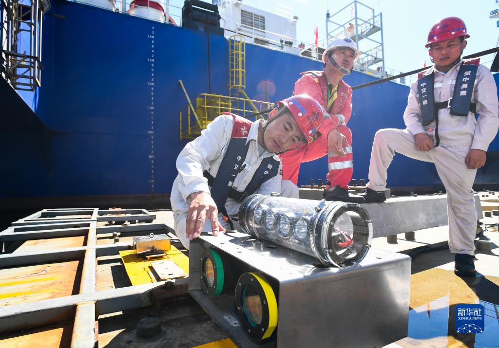 7月22日,在“一航津安1”号沉管运输安装一体船挂载的E19沉管上,测绘团队负责人锁旭宏(左一)为潜水员讲解拆解水下双目摄影定位设备的注意事项。