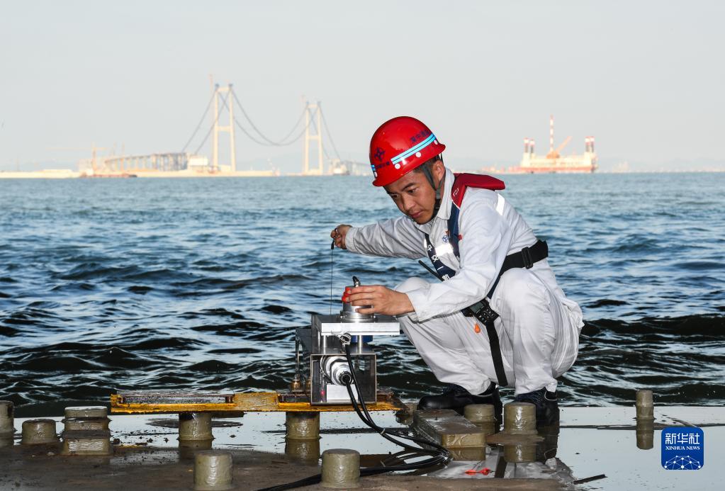 7月23日,在“一航津安1”号沉管运输安装一体船挂载的E19沉管上,测绘团队负责人锁旭宏在沉管安装前对水下拉线设备工作状况进行最后检查。