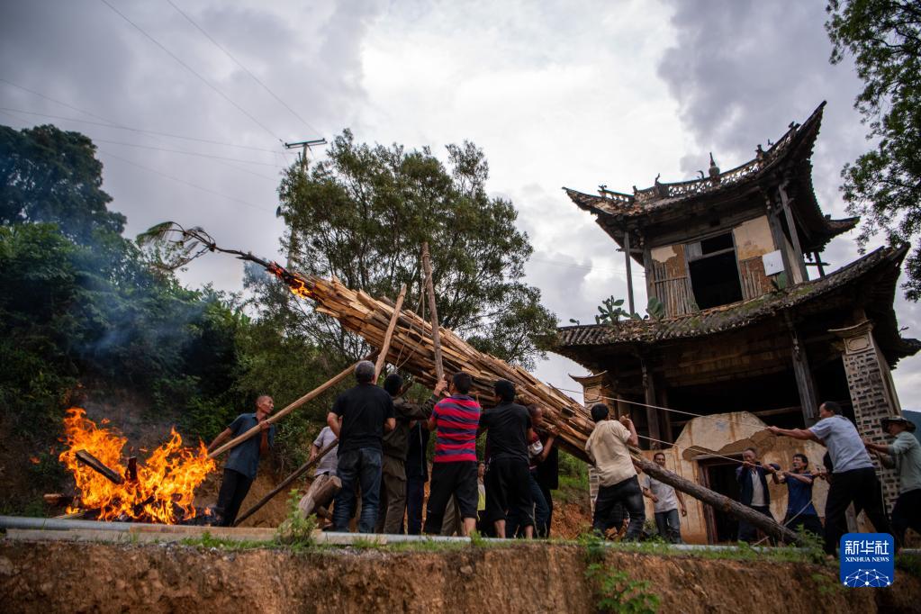 7月23日,云南省南涧彝族自治县太平村村民合力竖起大火把。按照当地习俗,有新生儿出生的家庭可以一起在村中竖一个大火把。