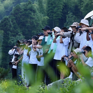 7月24日,参加活动的中小学生在自然教育导师的指导下野外观鸟。