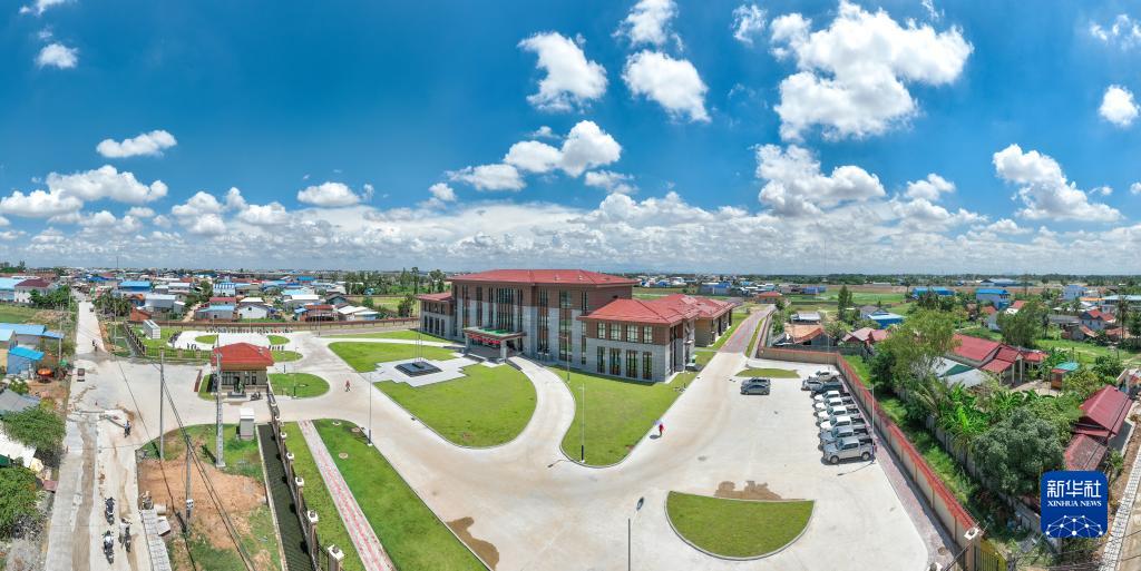 这是6月24日在柬埔寨金边拍摄的金港高速公路运营管理中心(无人机照片)。