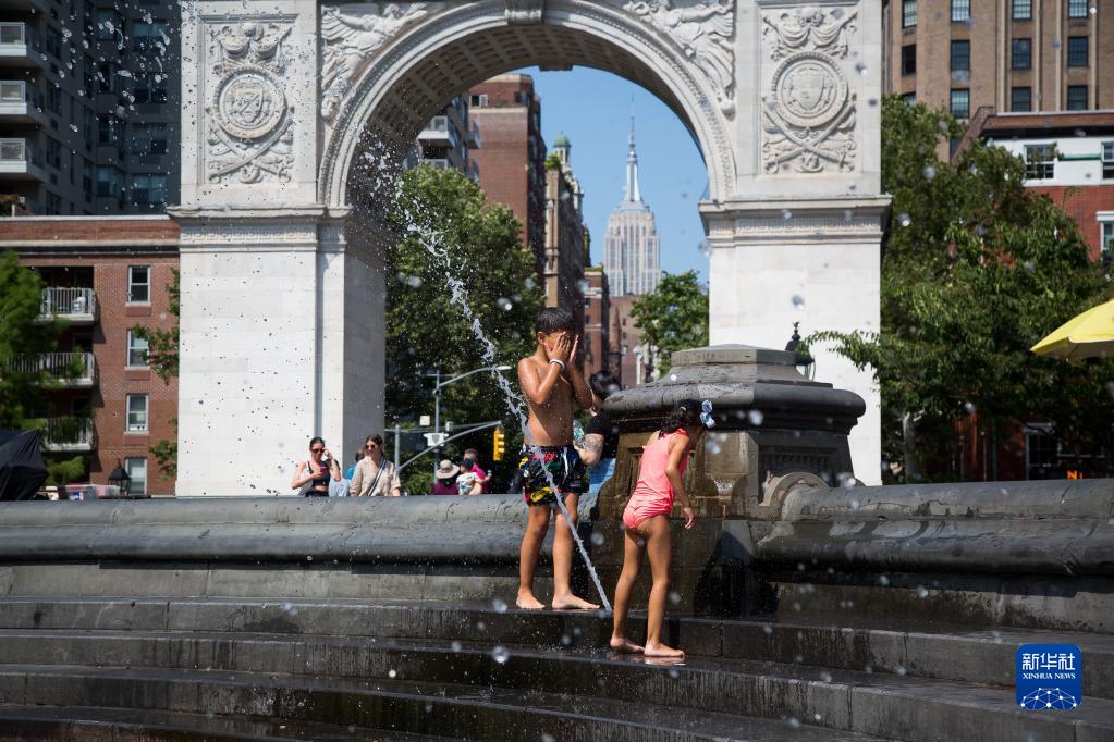 7月24日,在美国纽约,儿童在喷泉旁戏水纳凉。