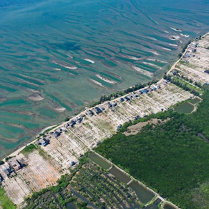 文昌推动冯家湾一类生态红线区内养殖池塘、养殖场全部退出,并通过种植红树林等方式开展生态修复(2022年6月1日摄,无人机照片)。