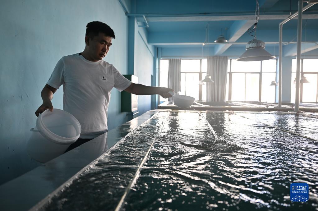 养殖户曾广能在文昌冯家湾现代化渔业产业园养殖示范厂房里给老鼠斑鱼苗喂食(2022年6月1日摄)。
