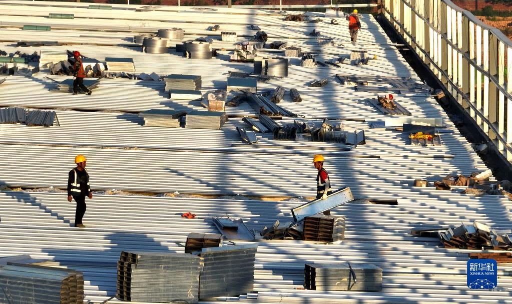 7月25日清晨,在广西柳州柳工集团柳工装载机灯塔工厂项目工地,工人在屋面施工(无人机照片)。