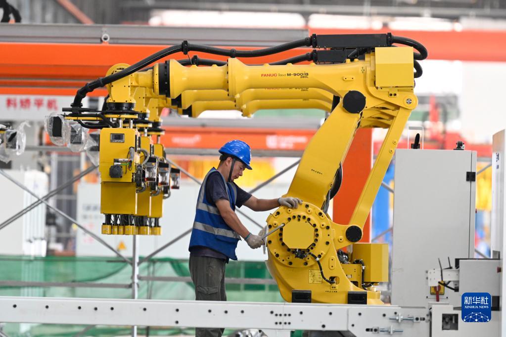 7月24日傍晚,在广西柳州柳工集团柳工装载机灯塔工厂项目工地,工人在车间里调试设备。