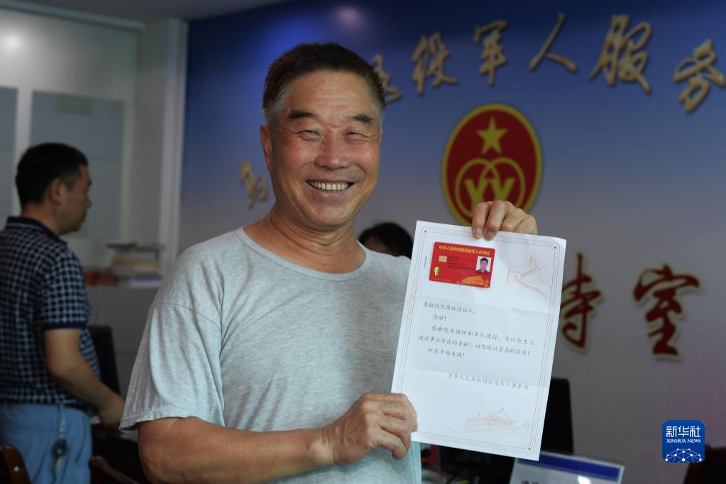 7月25日,退役军人申孝军在贵阳市乌当区退役军人服务中心展示刚领取的退役军人优待证。