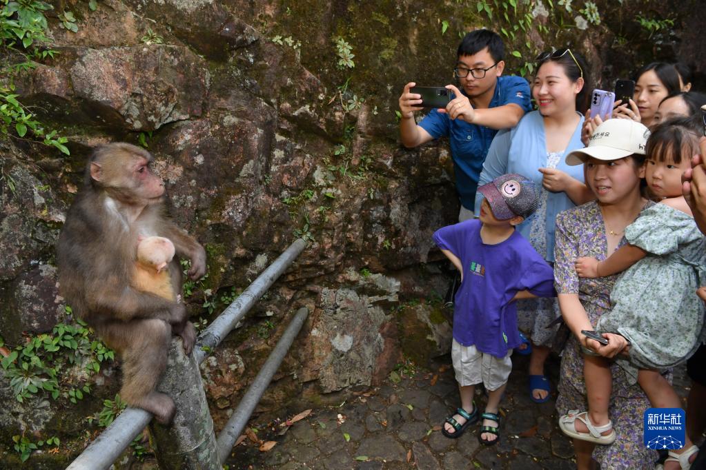 7月24日,在武夷山国家公园腹地桐木村附近,游客在观看藏酋猴。