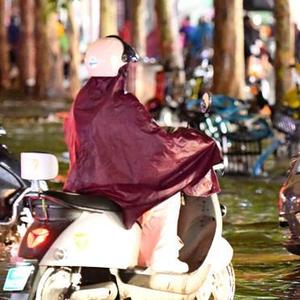 7月25日,在郑州市花园路上,市民涉水骑行。