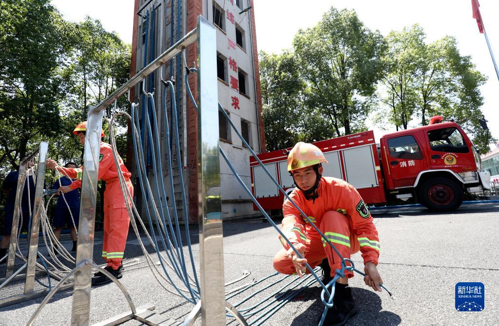 7月25日,湖南省资兴市消防救援大队队员在进行结绳操法训练。