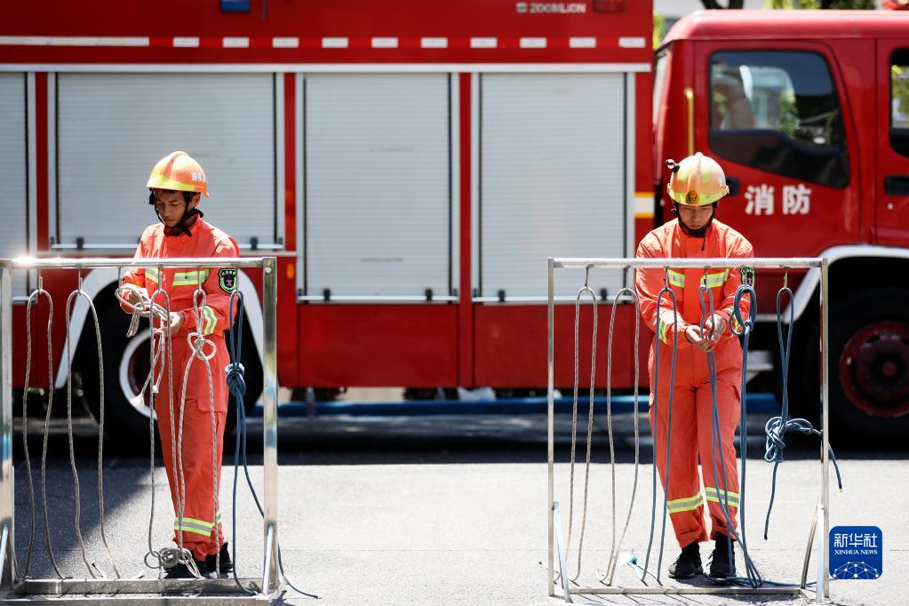 7月25日,湖南省资兴市消防救援大队队员在进行结绳操法训练。