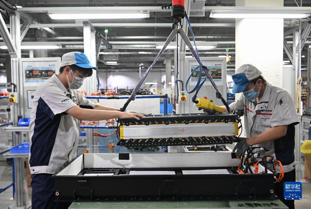 7月25日,在天津荣盛盟固利新能源科技有限公司总装车间,工作人员利用机械臂吊运电池模组。