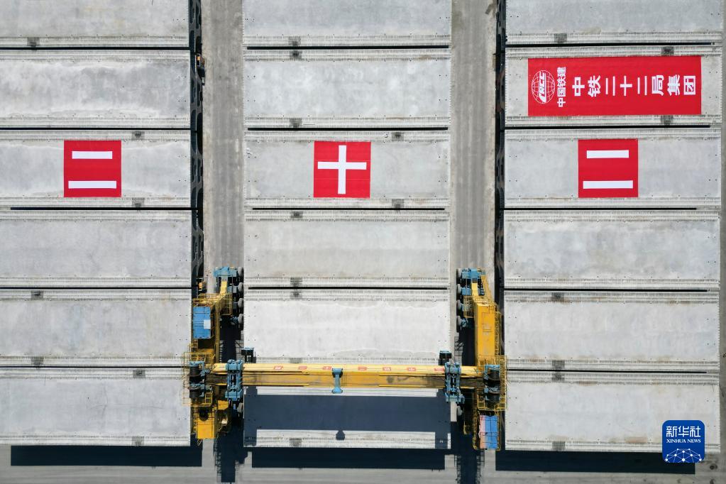 7月26日,在中铁二十二局集团有限公司伊春制梁场,工人在进行施工作业(无人机照片)。