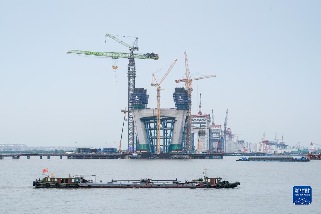 常泰长江大桥北岸工程正在施工中(7月26日摄)。