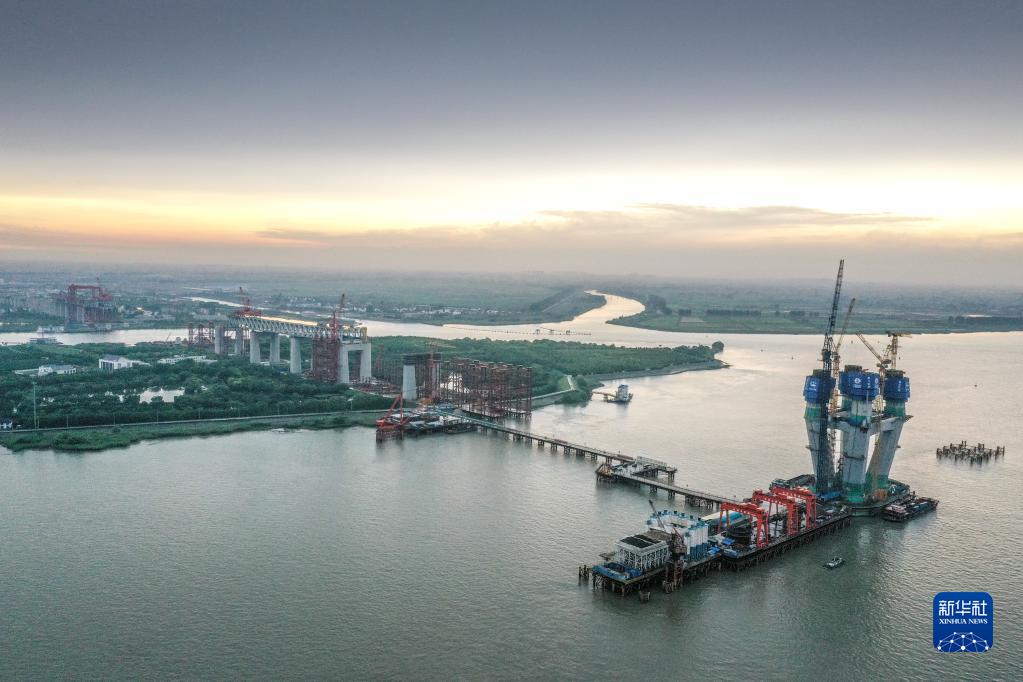 常泰长江大桥南岸工程正在施工中(7月26日摄,无人机照片)。