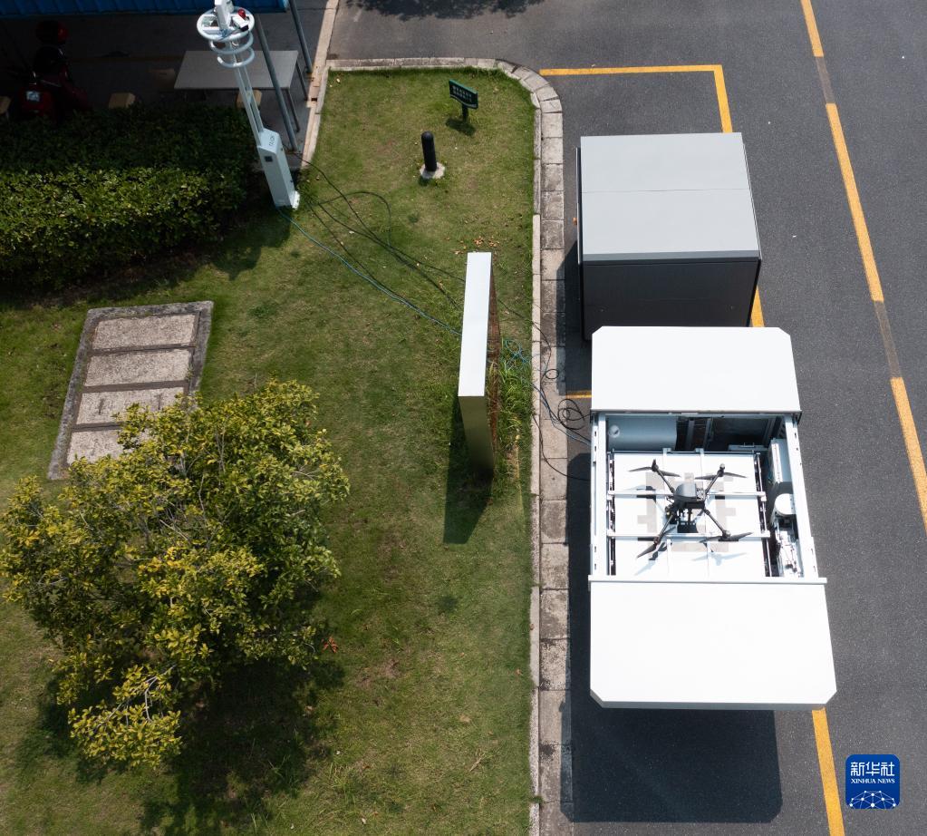 7月28日,无人机从机巢中准备完毕,即将起飞按照预先设定的线路进行巡检(无人机照片)。