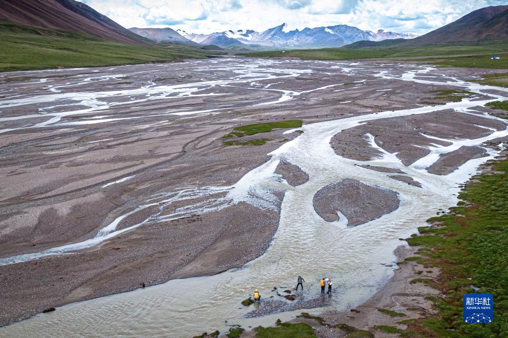 7月26日,来自长江科学院的科考队员在长江源区采集水样(无人机照片)。