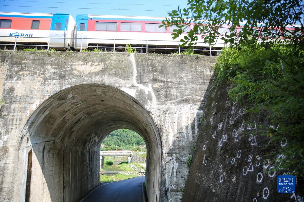 7月28日,在韩国忠清北道永同郡,列车从发生“老根里事件”的铁路桥上驶过,桥下的白色标记处是弹孔痕迹。