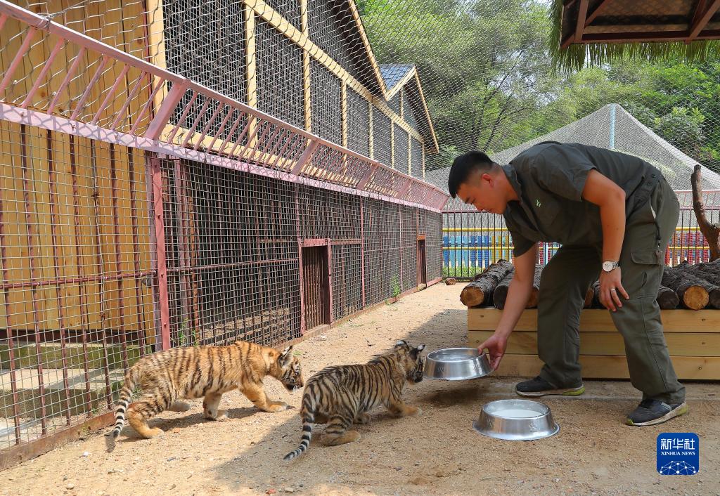 7月27日,饲养员方晓磊准备给小老虎喂食。