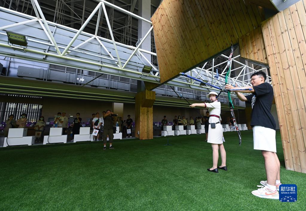 7月29日,学子在富阳银湖体育中心射箭馆体验射箭项目。该体育中心将承办杭州亚运会的射击、射箭、现代五项等项目。