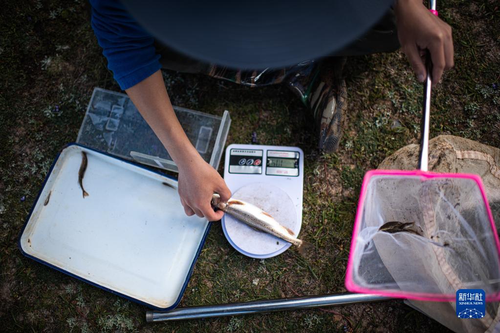7月25日,长江科学院科考队员刘晗在长江南源当曲对采集的一尾小头裸裂尻鱼称重。