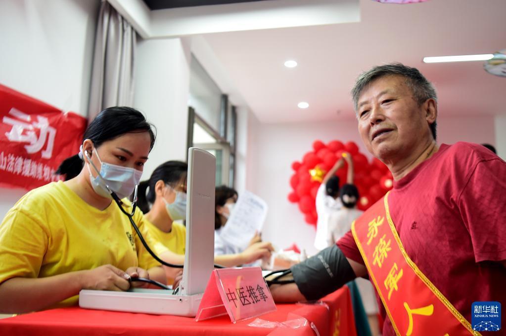 7月29日,洪岗社区志愿者为老兵测量血压。