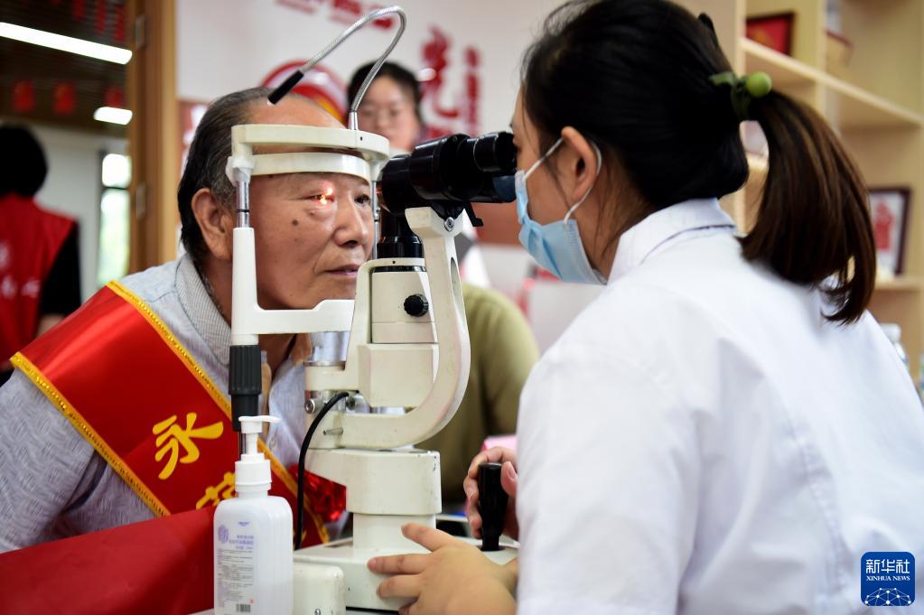 7月29日,洪岗社区志愿者为老兵检查眼部。