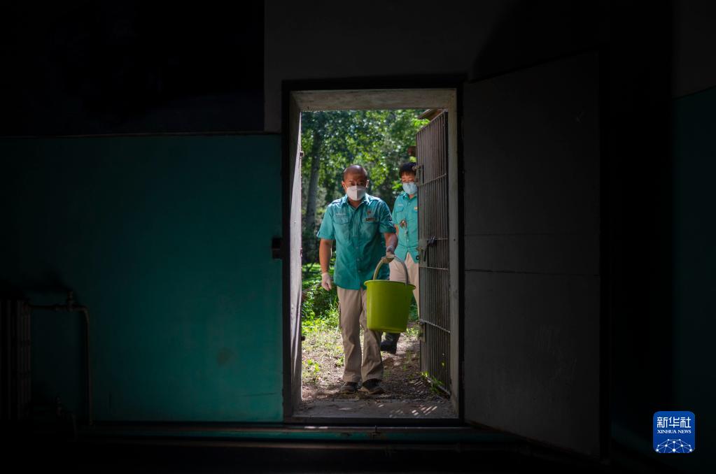 7月14日,在北京动物园猩猩馆,饲养员王争在户外运动场喂食完后打开栅栏门返回室内。