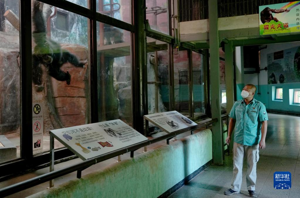 7月14日,在北京动物园猩猩馆,饲养员王争巡查猩猩馆。