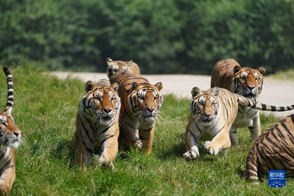 7月29日,东北虎在中国横道河子猫科动物饲养繁育中心野化训练区活动。