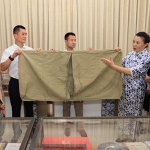 7月29日,展品提供者杨殿军(左四)和工作人员一起展示上世纪70年代部队使用的马褡子。