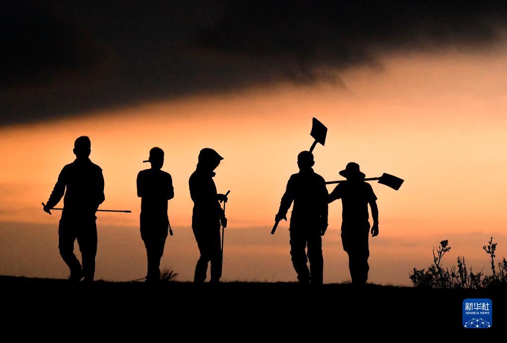 7月26日,治沙人员在地处毛乌素沙漠腹地的内蒙古自治区鄂尔多斯市鄂托克前旗百万亩柠条种植项目区行走。